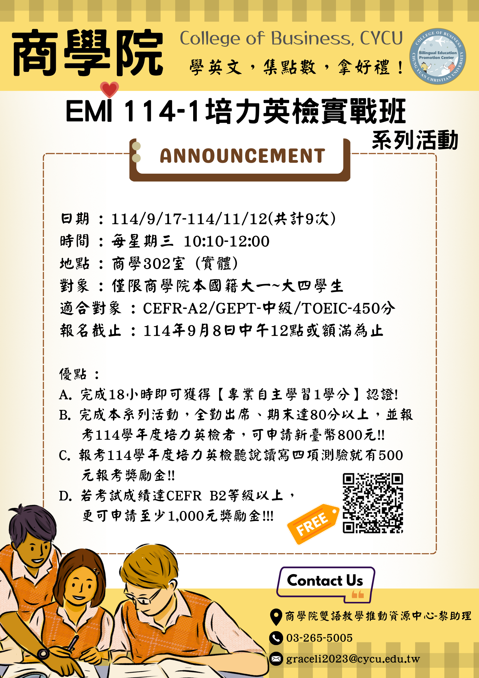 • 完成本系列活動,全勤出席、期末達80分以上,並報考114學年度培力英檢者,可申請800元獎勵金!!