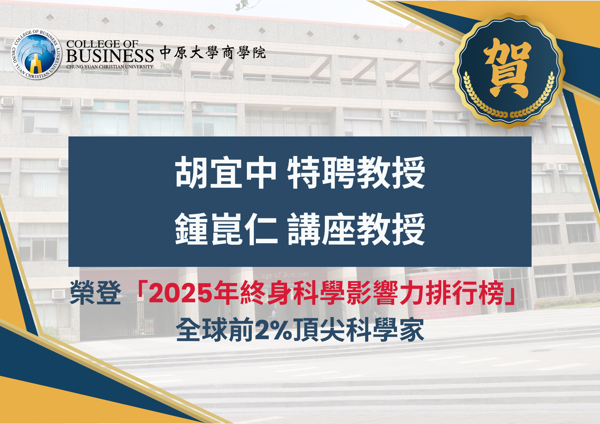在「2024年度科學影響力排行榜」中,商學院入榜教師包括企管系胡宜中教授,其研究成果在管理學界獲得廣泛引用與國際肯定。值得一提的是,這些入榜成就不僅彰顯教師個人學術實力,也凸顯中原大學商學院在培育兼具研究能力與國際視野人才方面的卓越成果。