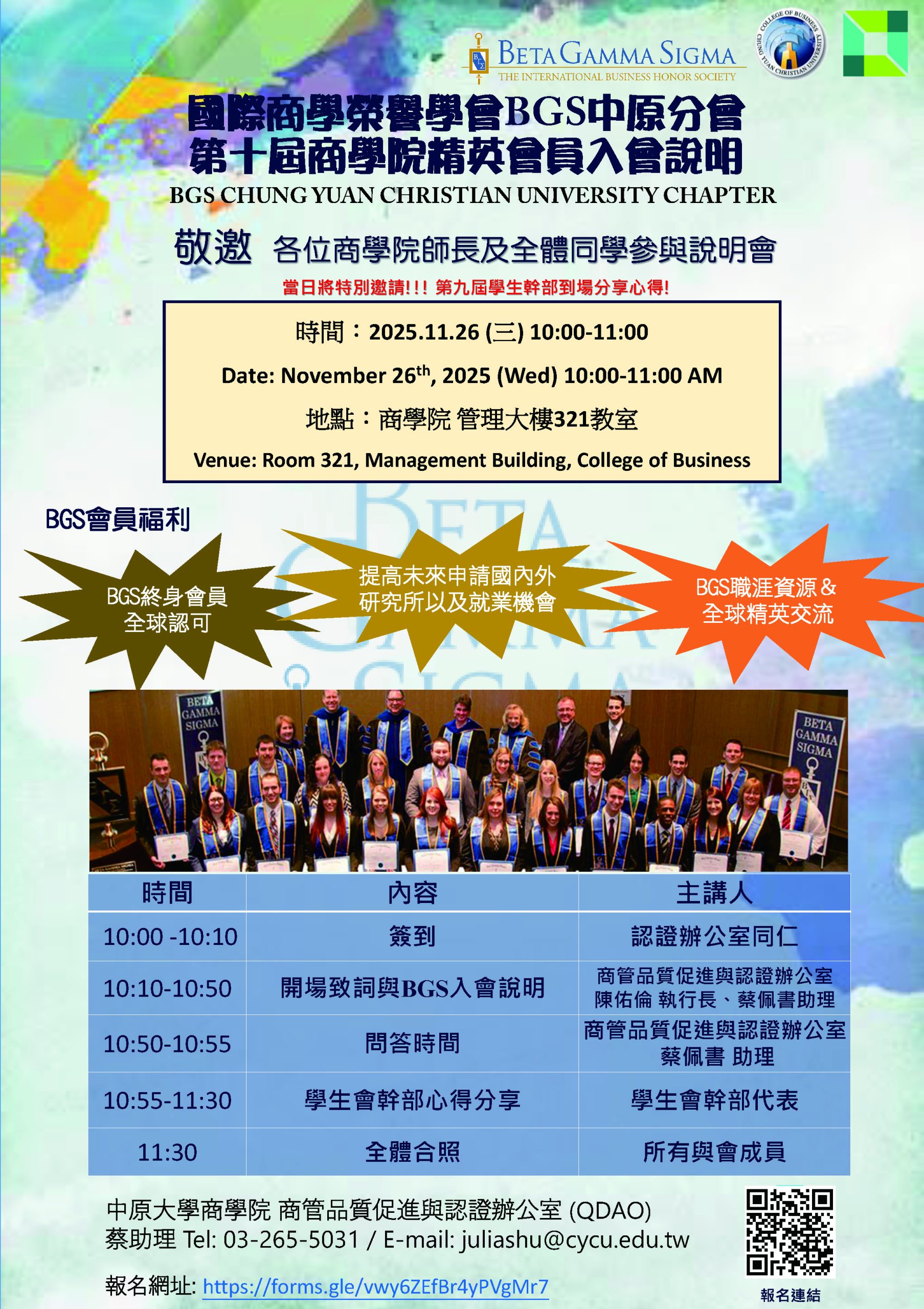 國際商學榮譽學會Beta Gamma Sigma(BGS)於1913年創立,目的在鼓勵學術上有優秀表現的商學院學生與學者。目前已成立了600多個商學榮譽分會,遍及全球超過190多個國家,並已有98萬傑出優秀的學者加入會員。只有通過國際菁英商管學會(AACSB)認證的學校,才有資格成立該組織的分會,本院已通過AACSB認證,並於2016年成立BGS中原分會。