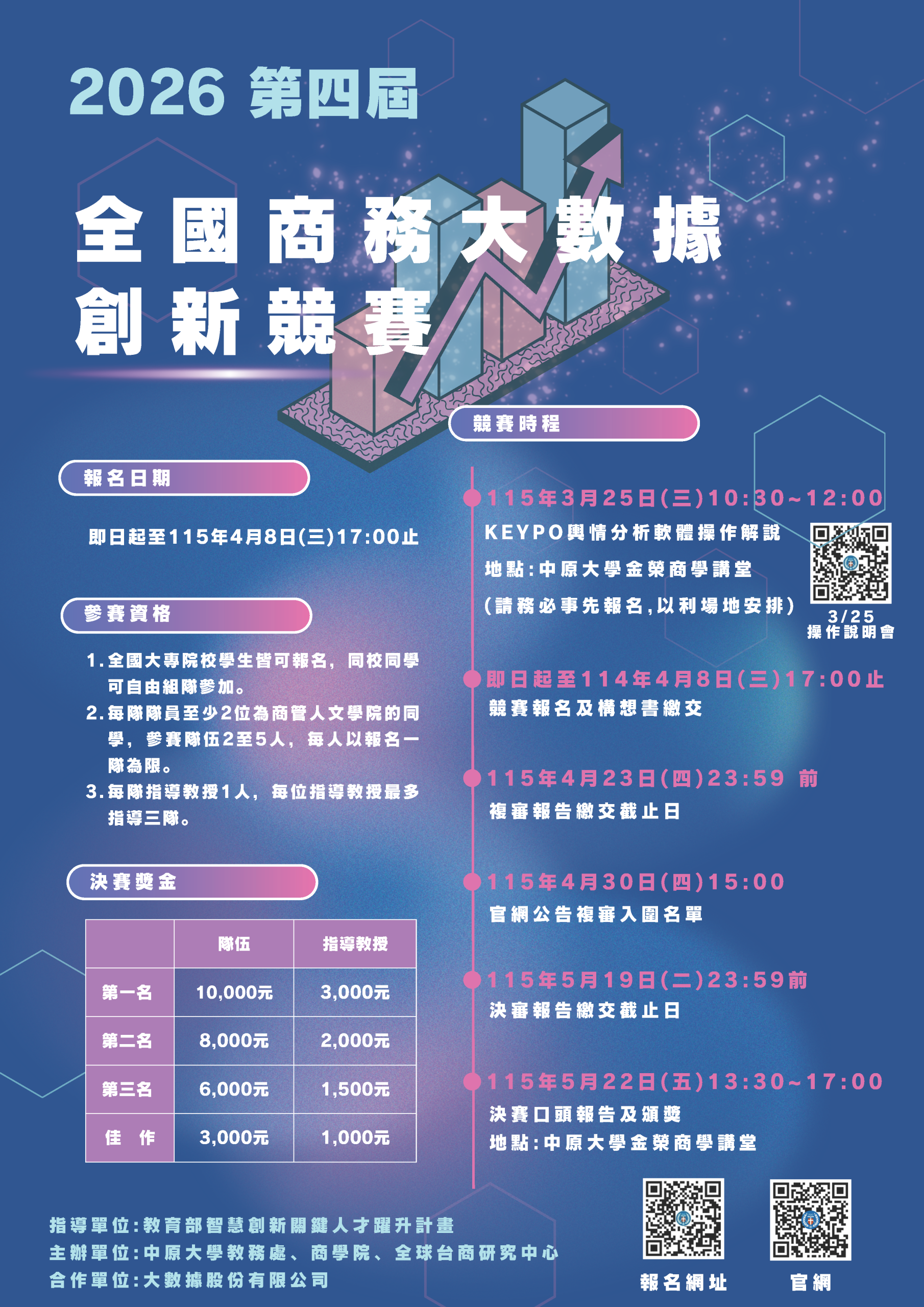 詳細競賽辦法與作業細則請詳閱「115年度第三屆全國商務大數據競賽辦法」