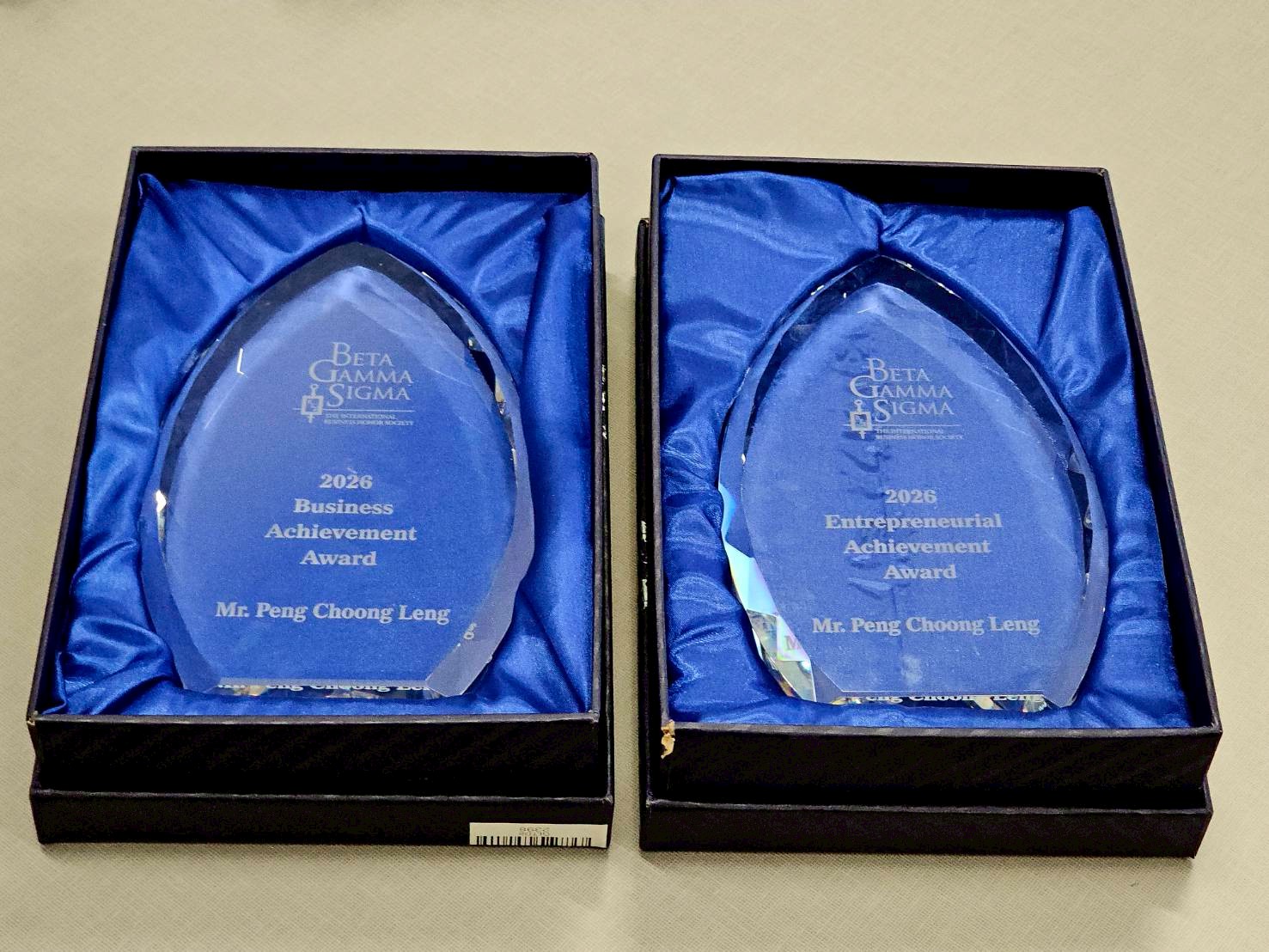 Dr. Peng Choong Leng, a distinguished alumnus of the College of Business at Chung Yuan Christian University (CYCU), has achieved a historic milestone. On April 14, 2026, at an award ceremony held in Seattle, USA, he was honored by Beta Gamma Sigma (BGS)—the International Business Honor Society—with both the Business Achievement Award and the Entrepreneurial Achievement Award. Dr. Peng has made a historic achievement: The first person in over 100 years of BGS history to sweep both awards and is the first person in Taiwan’s history to receive this double honor. This achievement is a testament to his professional excellence and highlights CYCU’s strength in cultivating world-class leaders.